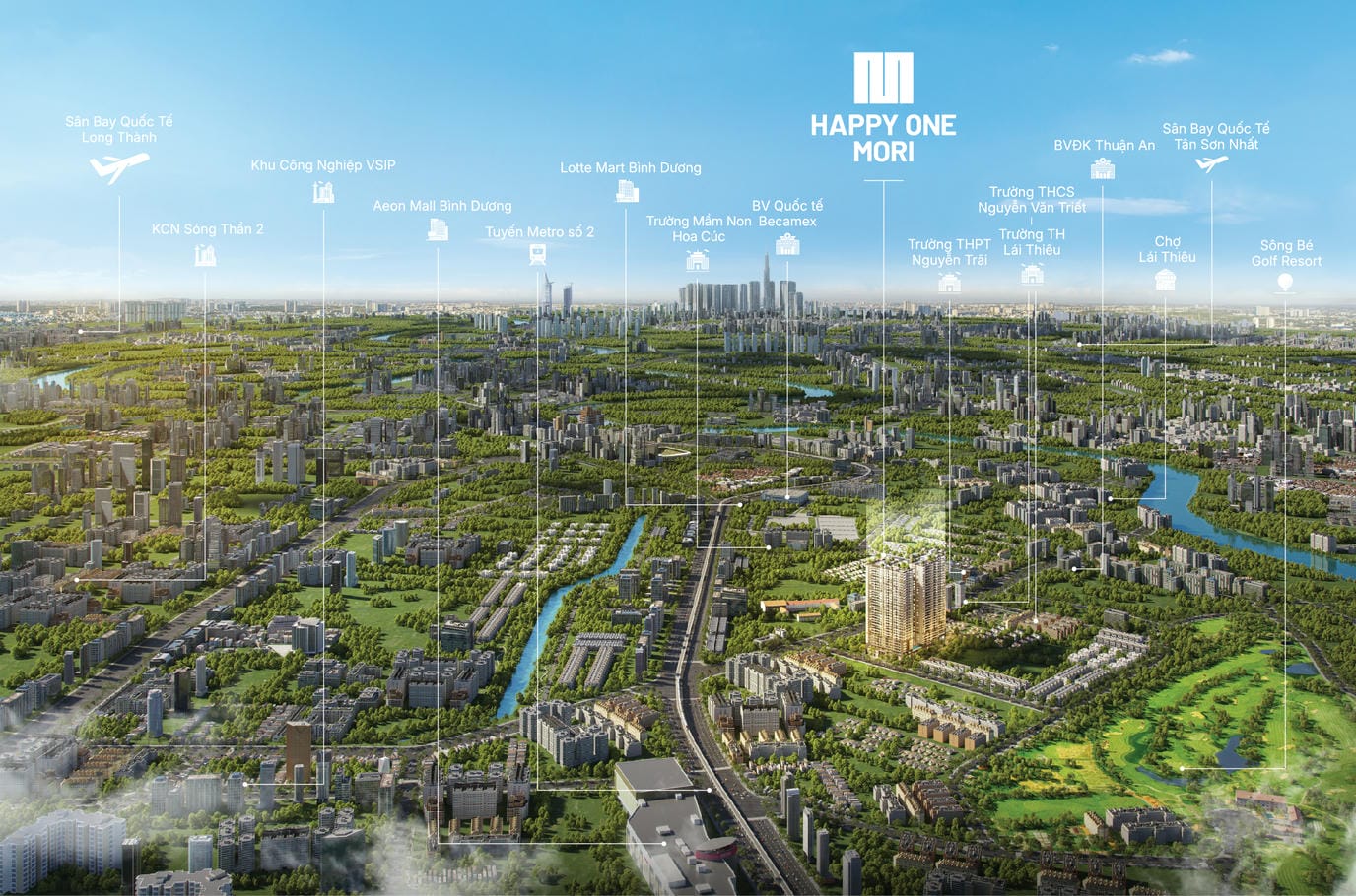 ✨ Môi trường sống lý tưởng: Bên cạnh tầm nhìn đắt giá sân golf Sông Bé và sông Sài Gòn, Happy One Mori còn nằm ngay giao điểm thịnh vượng, thừa hưởng sự phát triển đồng bộ về cả hạ tầng giao thông, văn hóa, giáo dục, thương mại, giải trí… giúp cư dân dễ dàng tiếp cận tiện ích đa dạng: trường học các cấp, bệnh viện quốc tế, trung tâm thương mại, khu vui chơi giải trí sầm uất…